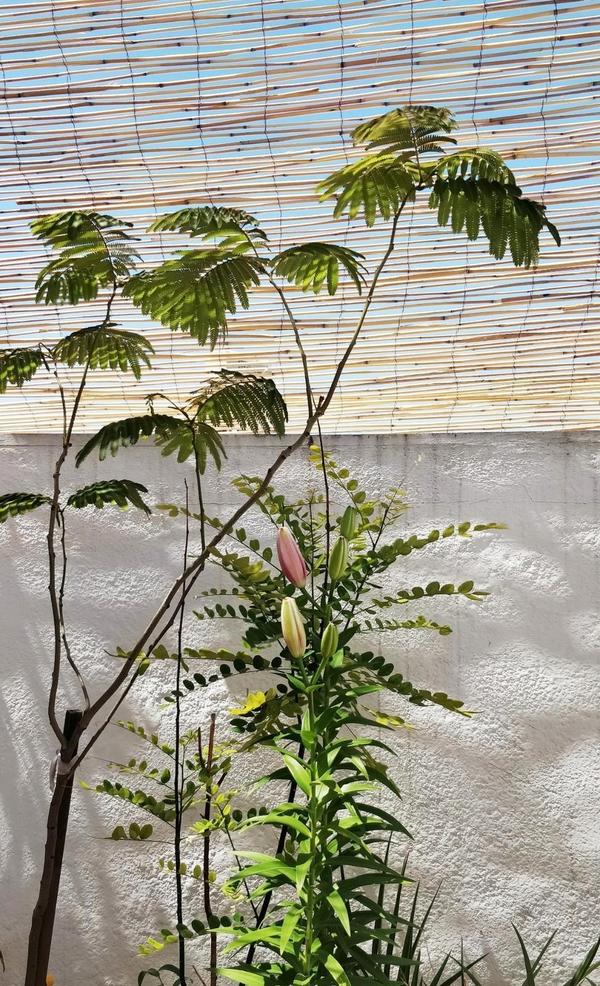 Mayo comienza sofocante. Un golpe de calor ha provocando en la albicia una repentina crisis desprendiéndose de todos sus brotes que llevaban dos meses creciendo. Otros nuevos le están comenzando a salir en la punta de